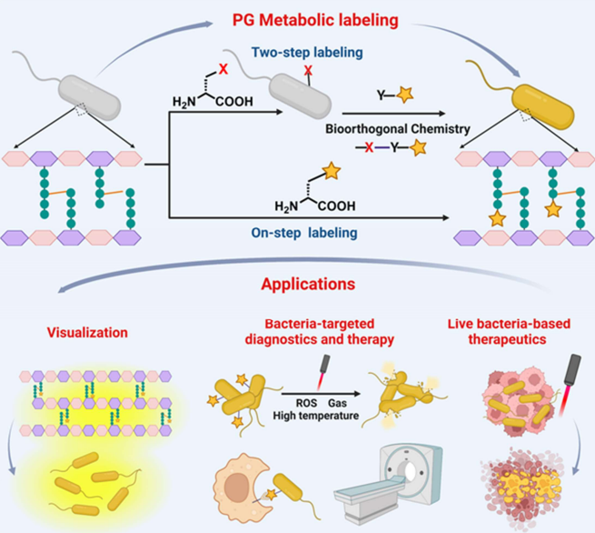 肽聚糖是几乎所有细菌细胞壁中必不可少的成分,它由含有d -氨基酸的茎肽连接的聚糖链组成。肽聚糖生物合成机制对各种d -氨基酸衍生物具有很高的耐受性。因此,具有不同功能的d -氨基酸衍生物可以特异性地结合到细菌的肽聚糖中并进行标记,但不能用于宿主哺乳动物细胞。本文介绍了利用d -氨基酸衍生物进行肽聚糖代谢标记的方法,包括一步法和两步法。此外,我们强调了基于d -氨基酸衍生物的代谢标记的各种应用,包括细菌肽聚糖可视化(存在,生物合成和动力学等),细菌可视化(包括细菌成像和可视化生长和分裂,代谢活性,抗生素敏感性等),致病菌靶向诊断和治疗(正电子发射断层扫描(PET)成像,光动力疗法,光热疗法,气体疗法、免疫疗法等),以及活菌疗法。