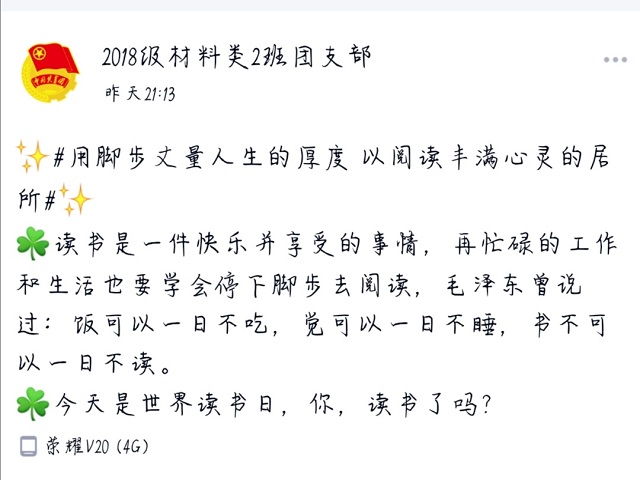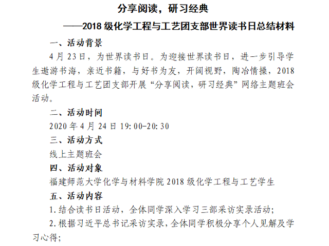 在郑瑜辉老师的引领下,2018级各团支部同学们通过微信建立班级群一同阅读习近平采访实录,在读书交流会上,同学们踊跃分享了阅读体会,通过读、思、悟的方式,感受习近平总书记在福建工作期间矢志不渝的初心坚守和永不懈怠的使命担当。同时,各团支部也踊跃开展读书节相关活动,通过多种形式的线上互动,带领支部成员感受习近平总书记对福建建设作出的卓越贡献。活动结束后,各团支部对同学们的心得体会及读书笔记进行整理,积极做好材料总结。