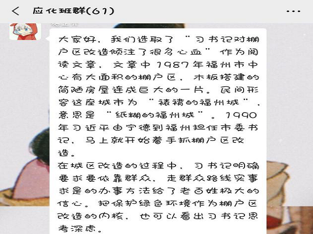 近日,福建师范大学化学与材料学院开展学习《习近平在厦门》《习近平在宁德》《习近平在福州》系列采访实录活动。福建师范大学青年讲师团成员、化学与材料学院团委书记郑瑜辉老师引领2018级各团支部组织线上读书交流会,在阅读讨论中营造良好学习氛围,领会习近平新时代中国特色社会主义思想。