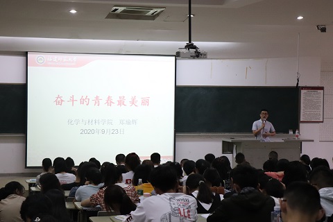 23日下午,福建师范大学旗山校区化学与材料学院于知明2-202举行了一场以“奋斗的青春最美丽”为主题的讲座。团学事务办公室主任、团委书记郑瑜辉老师向化材学院的新生们阐述了青春的深刻意义,鼓励他们寻找前进方向,把握大学时光,投入新阶段的奋斗青春。